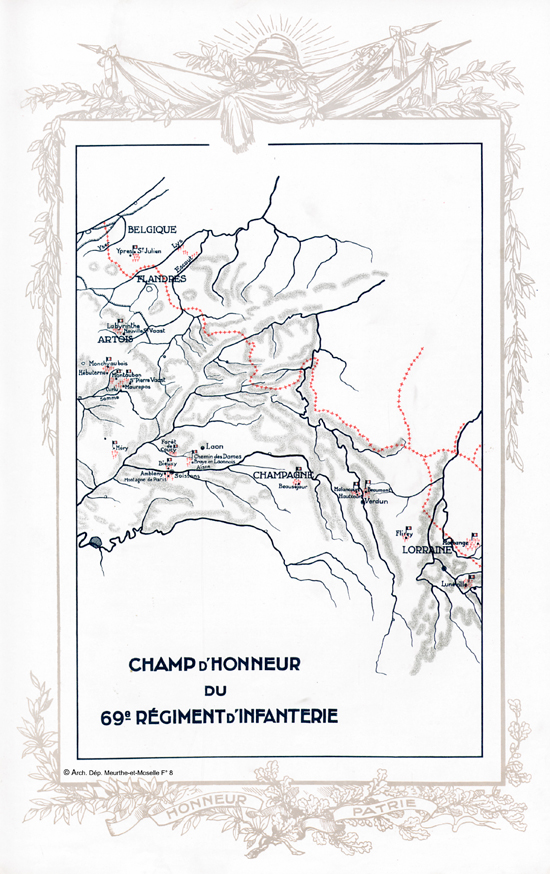 Le 69e régiment d'infanterie cantonné à Nancy et Toul fait partie de la 11e Division dite "de fer". On peut voir sur cette carte que les différentes batailles auxquelles il a participé durant le conflit épousent la quasi intégralité d'une ligne de front fixée dès l’automne 1914. Ainsi, de l'ouest vers l'est, le 69e R.I. a combattu respectivement dans les Flandres, en Artois, en Picardie, en Champagne et en Lorraine, exception faite de l'Alsace.