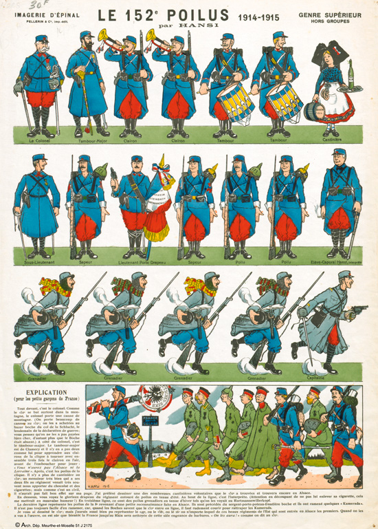 Le 15-2 est le régiment du caporal Hansi (1873 † 1951) qui s'est représenté dans sa fonction d'interprète. La représentation de son unité reprend clairement les canons des images d'Épinal d'époque napoléonienne. Il demeure que l'allusion traduit - malgré elle (?) - l'inadaptation relative de l'uniforme français à la guerre moderne. On le constate dans l'archaïsme des grenades, l'inconfort de la vareuse, voire la présence d'une cantinière.