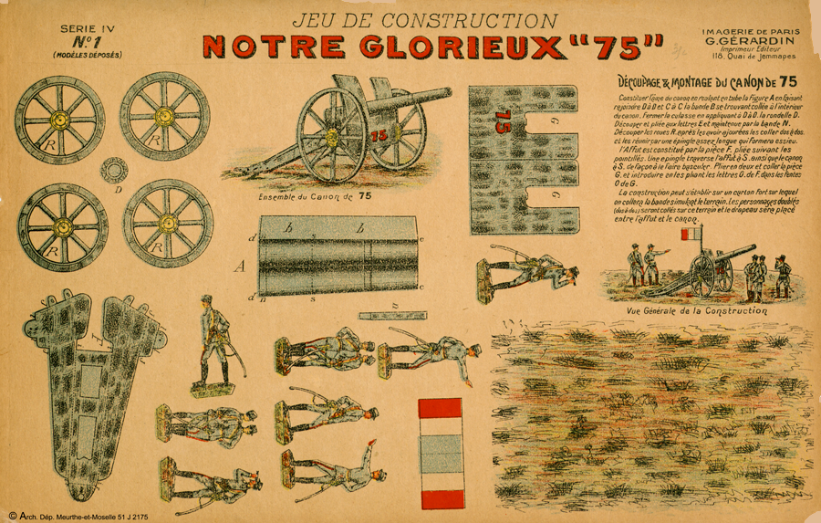 Le "glorieux 75" apparait comme l'arme la plus moderne de l'armée française, celle-là même qui a permis de repousser les offensives allemandes sur le Grand Couronné. On le voit ici surmonté d'un drapeau tricolore, représentation peu réaliste car sa portée de 8,5 km l'oblige à être discret face à l'artillerie lourde allemande.