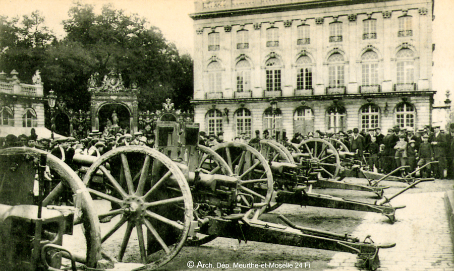 Une foule nombreuse encadre les canons pris à l'ennemi, sans doute après les combats de la trouée de Charmes. En exposant ces trophées sur la place symbolique de la capitale lorraine, les autorités font œuvre de propagande. En réalité, l'effet psychologique est incertain car la population découvre que les armes de mort de l'ennemi n'ont rien à envier à celles de la République.
