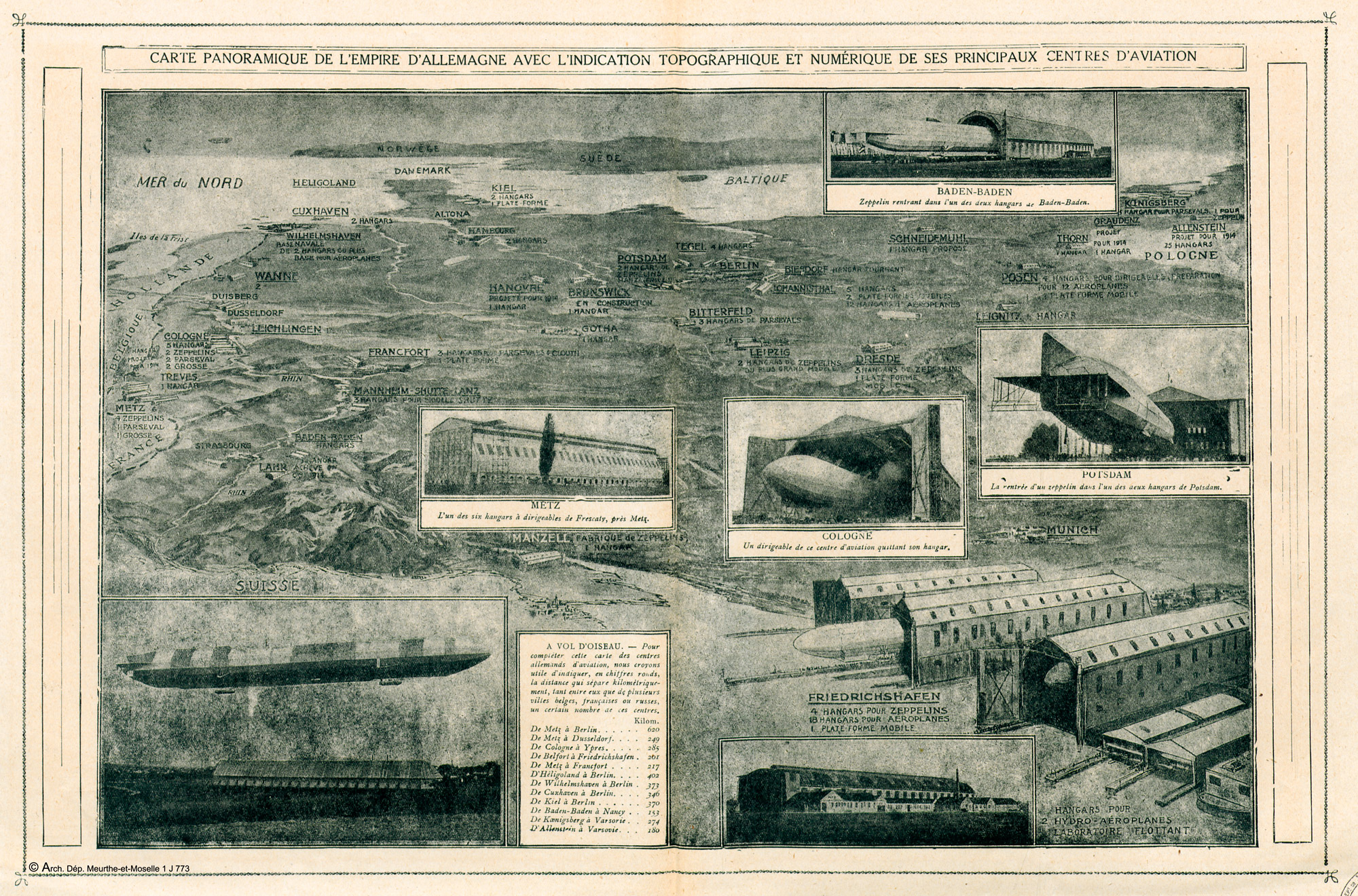 La carte en perspective offre une vision panoptique des capacités aériennes de l'Allemagne. La présence de gravures des principales bases aériennes ainsi que les distances tendent à lui donner de surcroît un caractère scientifique. Néanmoins, on pourrait croire que les forces aériennes ennemies se limitent aux zeppelins tant sont rares les indications faisant mention d'aéroplanes. En Lorraine occupée, on constate clairement l'importance stratégique de Metz.