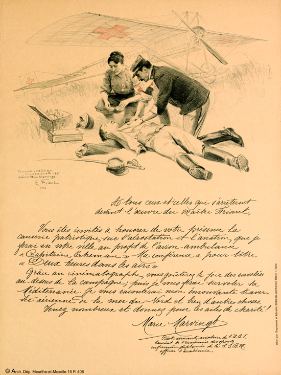 Cette affiche annonce une conférence de la pionnière féminine de la conquête aérienne et des défis sportifs, Marie Marvingt (1875 † 1963). Dès le début de la guerre, elle organise l'aviation sanitaire avec son avion-ambulance "Capitaine Echeman" qu'elle mène sur le front pour évacuer les blessés. Ici, tout dans l'image montre la modernité : l'émancipation féminine, l'innovation humanitaire, l'utilisation du cinématographe à des fins de propagande.
