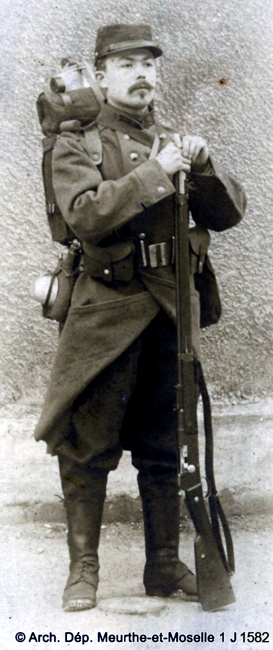 Ce portrait anonyme d’un soldat nancéien à l’allure martiale présente l’équipement-type d’un combattant à la veille et au début du conflit. Vêtu de la capote en laine gris bleuté et du pantalon garance, chaussé de brodequins en cuir, coiffé du képi lui aussi de couleur rouge et bleue, le poilu est particulièrement vulnérable de par sa visibilité et de par l’incommodité de sa tenue vestimentaire. Par ailleurs, le soldat porte le havresac modèle 1893 qui, avec les autres éléments de l’équipement, impose au combattant un poids de quelque 30 kg. Le poilu ainsi photographié est apparenté à la famille Huel et semble appartenir au 93e régiment d’infanterie d’après l’indication réglementaire et régimentaire portée sur son collet.