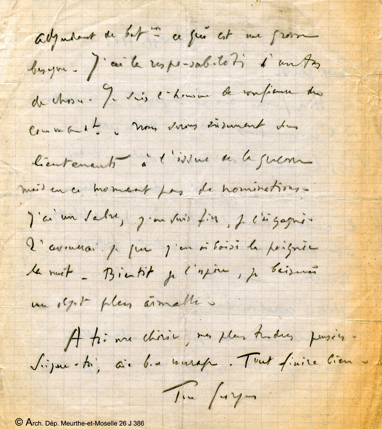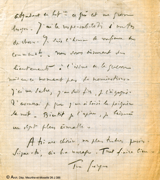 C’est à un être proche que s'adresse ce soldat. En peu de mots il témoigne d'une acceptation totale de sa situation de combattant malgré les difficultés liées au combat ou aux conditions de vie.