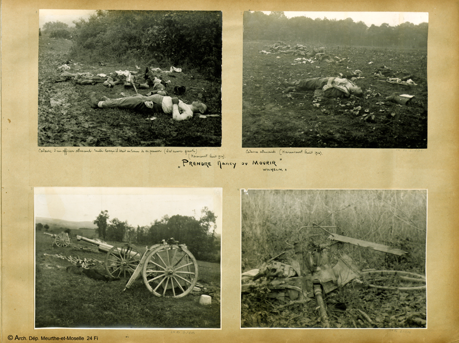 Les clichés pris pendant ou peu après les combats sont rares. Seuls quelques photographes agréés par l’autorité militaire peuvent se rendre sur les lieux quelques heures après les affrontements. Là, c'est le plus souvent l'ennemi mort qui est montré, quitte parfois à user de simulacres. Ces vues des environs d'Haraucourt traduisent la crudité du champ de bataille : les cadavres, l'éparpillement des équipements, les armes intactes ou pulvérisées offrent les clés d'une violence que le spectateur reconstitue.