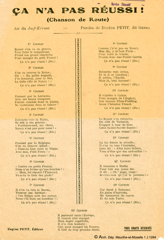 La chanson de propagande est un genre entièrement à part de l'idéologie de guerre. Paradoxalement, Eugène Petit tourne en dérision l'empereur d'Allemagne tout en énumérant l'avancée de ses armées en France. Il est plus lucide en liant le sort de la Marne à la bataille du Grand Couronné.