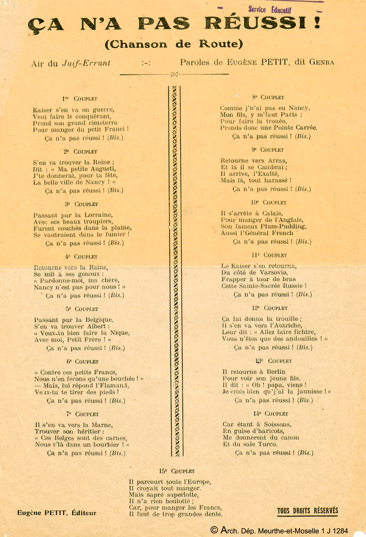 Chanson d'Eugène Petit dit Genra, sans date.