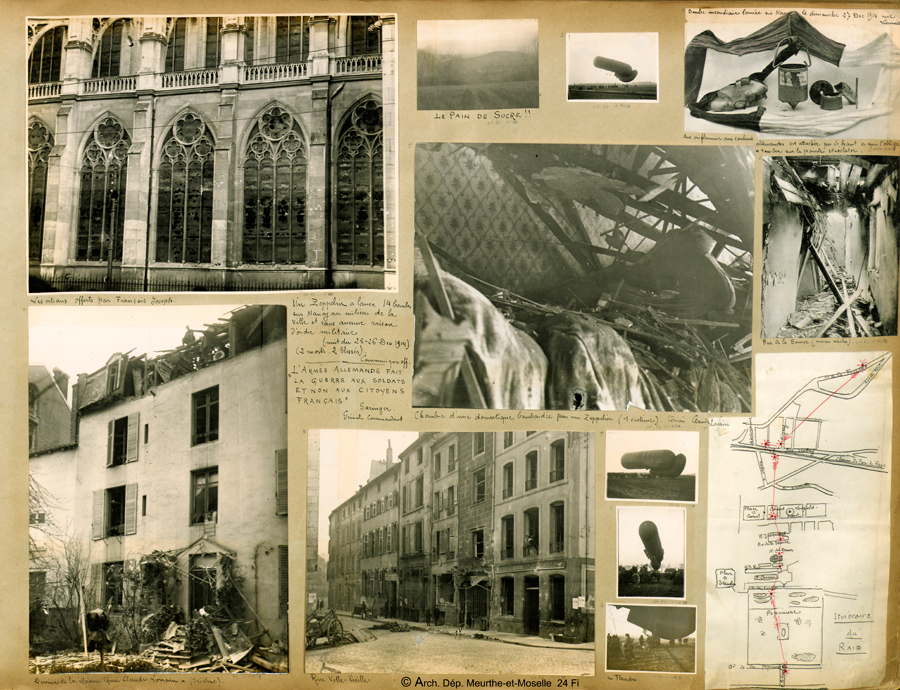 Léon Poiré oppose la propagande allemande au communiqué officiel et à la puissance évocatrice de la photographie pour démontrer la violation des règles de la guerre par l’ennemi. De fait, cette planche de photographies intègre tous les moyens à sa disposition pour prouver l'événement dans une démarche quasi journalistique, y compris un plan de situation, les restes de bombes incendiaires et des vues de dirigeables (ennemis ?).