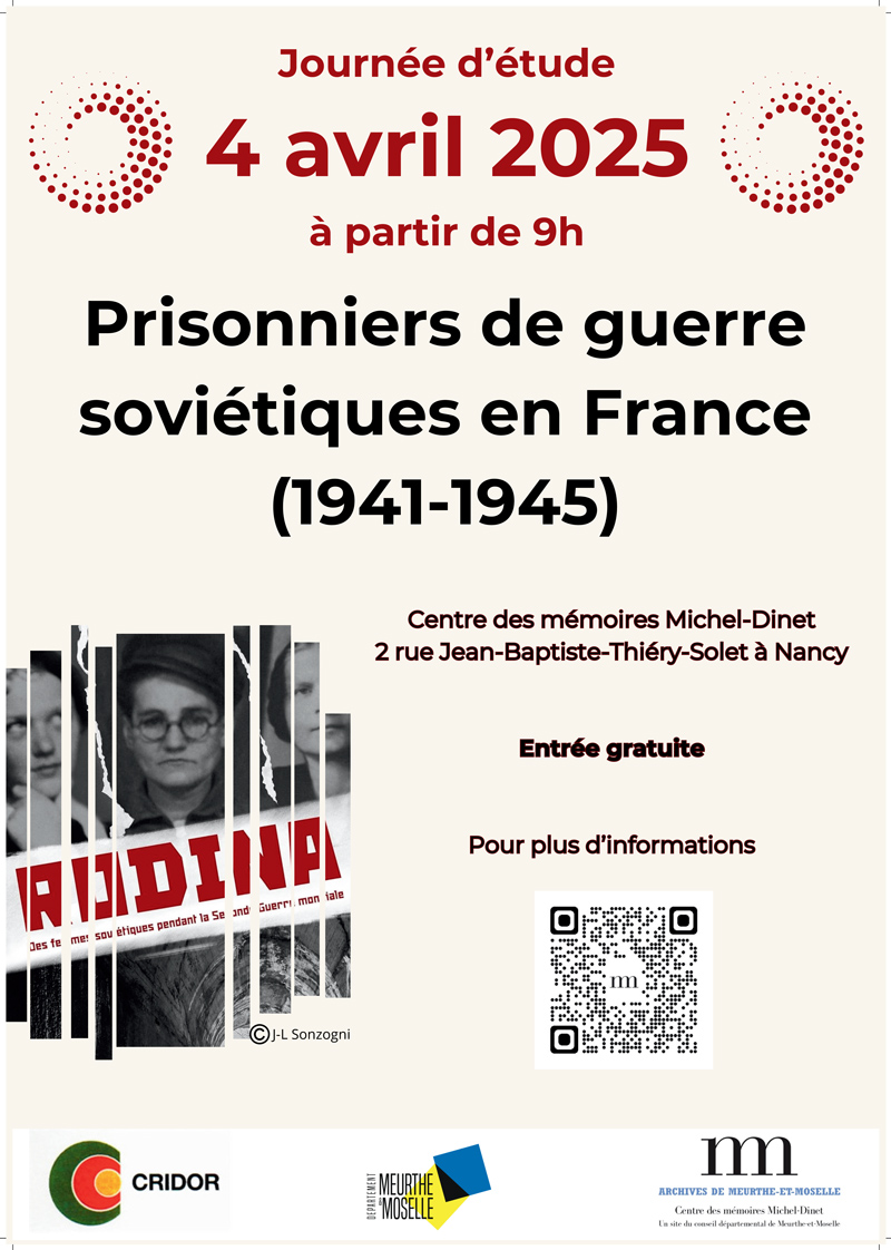 Le vendredi 4 avril 2025, s’est tenue la journée d’étude Prisonniers de guerre soviétiques en France (1941-1945) aux archives départementales de Meurthe-et-Moselle. Organisée par le Département de Meurthe-et-Moselle et le Centre régional et international de documentation et de recherche (association CRIDOR), cette journée a permis de tirer un premier bilan des recherches tant personnelles qu’associatives et universitaires menées en France ces dernières années et de dégager des pistes de recherches.