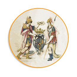 Parti d’argent et de gueules, à deux lions affrontés tenant chacun un sabre mis en pal de l’un en l’autre